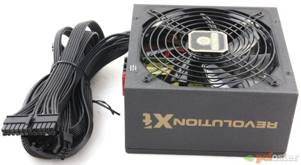 Model Revolution X’t 730 W został wykonany z matowego, czarnego materiału, który jest lekko chropowaty. Nie zabrakło na jego powierzchni oczywiście złotych akcentów. Na bocznych ściankach widzimy duży napis serii Revolution X’t. Wersja o mocy 730 W ma wymiary 150 x 86 x 160 mm, więc nie jest to najdłuższy zasilacz dostępny na rynku, ale zawsze warto sprawdzić czy takowy zmieści się w naszej obudowie. Warto podkreślić, że spełnia on warunki standardu ATX, więc powinien bez problemu pasować do większości obudów na rynku. Jego waga to trochę ponad 3 kilogramy.