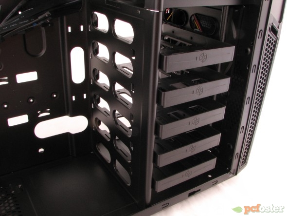 Z przodu obudowy mamy pięć zatok na dyski twarde lub SSD. Każdy z nich mocujemy na specjalnej tacce za pomocą czterech śrub (są w zestawie). Na froncie zamontowano jedyny w tym modelu wentylator 120 mm. Poza tym Silverstone udostępnia wolne miejsca na śmigła z tyłu (jedno), z przodu (w sumie dwa) i na górze (dwa 120 lub 140 mm). Nad dyskami mamy cztery wolne miejsca na napędy optyczne, które montujemy bez użycia narzędzi. Producent zastosował tutaj prosty system blokujący, wykonany z plastiku.