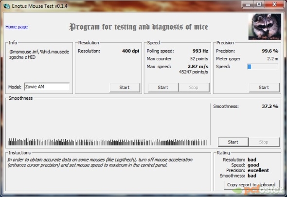 Testy przeprowadzone we wszystkich trzech rozdzielczościach wykazują precyzję na poziomie powyżej 99%. To bardzo dobry wynik. Również częstotliwość raportowania USB jest bliska 1000 hz, czyli wartości deklarowanej przez producenta. Niestety na powyższych zrzutach widzimy bardzo niską prędkość maksymalną. W związku z tym mysz ta, może nie być najlepszym wyborem dla graczy lubiących robić zamaszyste ruchy na podkładce (low sens). W przypadku jeśli jednak preferujemy średnie prędkości, około 20-35 cm na obrót postacią w grze o 360* wynik ten będzie zadowalający i nie powinniśmy odczuć żadnych negatywnych objawów podczas gry. Zdarzało się że, podczas testów enotus wykazywał prędkość maksymalną dla każdej z rozdzielczości powyżej 3m/s jednak były to wyniki graniczne i podczas osiągania takich prędkości dało się zauważyć, że kursor i tak nie pracuje prawidłowo.